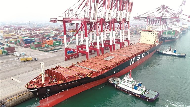 1月4日,澳洲直航新航線首班船舶靠泊山東港口青島港,標(biāo)志著該港2026年首條外貿(mào)新航線正式開(kāi)通。圖為澳洲直航新航線首班船舶——“地中海杰西尼亞”輪靠泊山東港口青島港。新華社發(fā)(張進(jìn)剛 攝)
