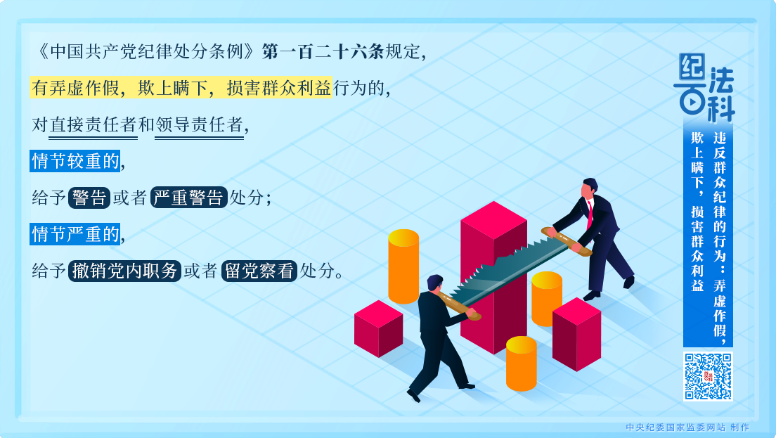 《中國(guó)共產(chǎn)黨紀(jì)律處分條例》第一百二十六條規(guī)定,有弄虛作假,欺上瞞下,損害群眾利益行為的,對(duì)直接責(zé)任者和領(lǐng)導(dǎo)責(zé)任者,情節(jié)較重的,給予警告或者嚴(yán)重警告處分;情節(jié)嚴(yán)重的,給予撤銷(xiāo)黨內(nèi)職務(wù)或者留黨察看處分。
