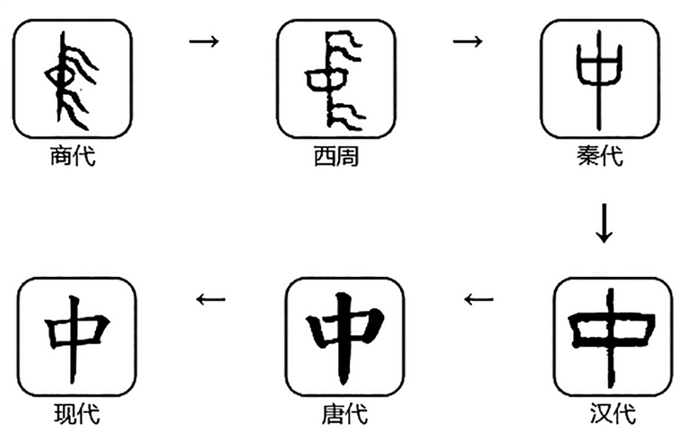 甲骨文“中”象旗幟之形,其上下部都有飄帶。直線的中間加上圈形指示符號,表示中央、中點等一般含義。秦系簡牘的“中”字省略了象征斿的部分,小篆和隸書字形中間的圈形又變?yōu)榉叫?,成為了現(xiàn)在楷書的“中”。