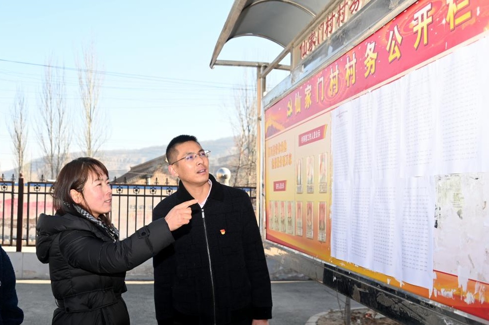 隴西縣紀(jì)委監(jiān)委推動(dòng)加大農(nóng)村集體“三資”公示公開(kāi)力度,督促各村(社區(qū))綜合運(yùn)用管理平臺(tái)、村務(wù)公開(kāi)欄等,及時(shí)公開(kāi)“三資”管理使用情況。圖為近日,該縣文峰鎮(zhèn)紀(jì)檢監(jiān)察干部在仙家門(mén)村查看公開(kāi)公示情況。崔翔龍 攝