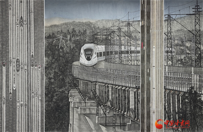 由甘肅畫院青年畫院劉峰至創(chuàng)作的國畫《中國高鐵進大山》