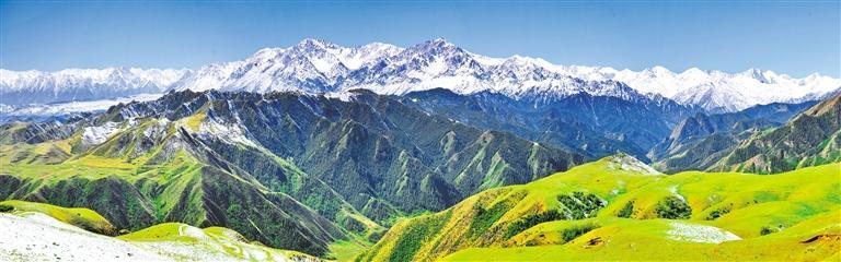 初秋的祁連山,碧空如洗,遠(yuǎn)峰疊翠。山頂?shù)姆e雪在陽光照射下閃閃發(fā)光,陣陣清風(fēng)拂過黃綠交錯的山林,驚起幾只飛鳥……