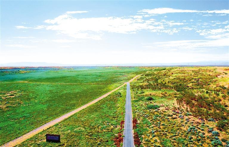 古浪縣北部沙區(qū)十二道溝附近,綠色在沙漠中延伸。新甘肅·甘肅日報(bào)記者 金奉乾