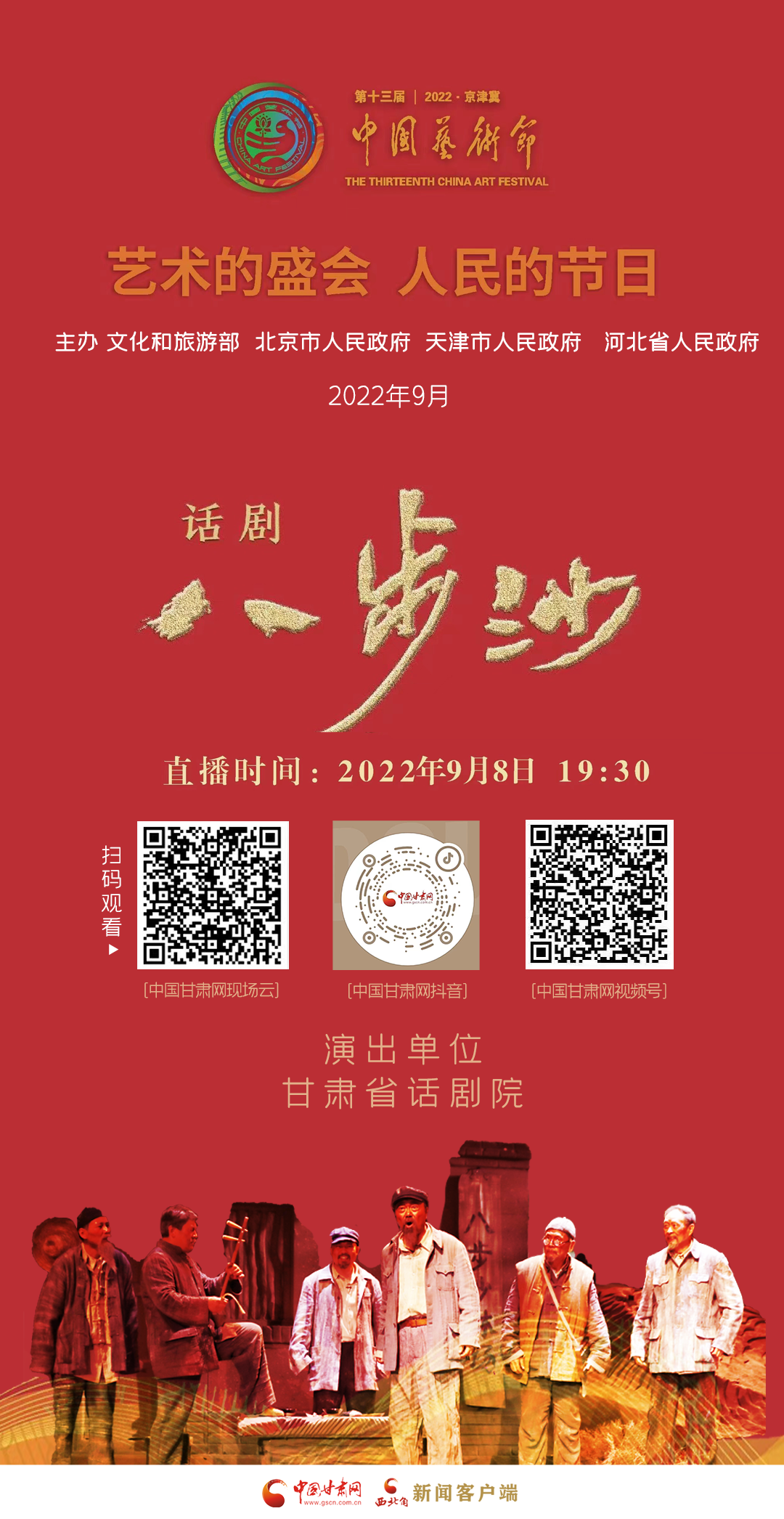 9月1日,由文化和旅游部、北京市政府、天津市政府、河北省政府共同主辦的第十三屆中國藝術(shù)節(jié)在北京開幕。隨著藝術(shù)節(jié)大幕徐徐拉開,劇目展演和“文華獎(jiǎng)”評(píng)審工作同步展開,入圍第十七屆文華大獎(jiǎng)終評(píng)作品的話劇《八步沙》將代表甘肅省,與全國新創(chuàng)排的38部舞臺(tái)藝術(shù)作品一起角逐最終的文華大獎(jiǎng)。根據(jù)疫情防控要求,話劇《八步沙》將以線上評(píng)審的方式參演,期待廣大觀眾屆時(shí)觀看并點(diǎn)評(píng)。