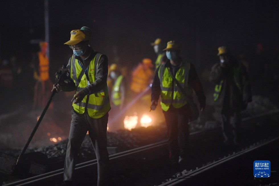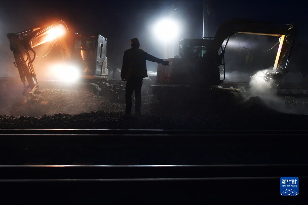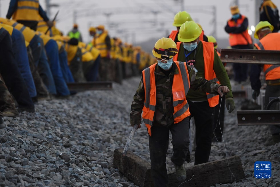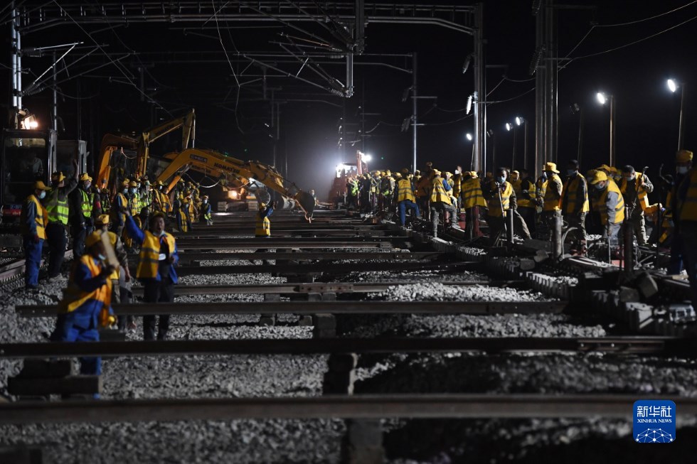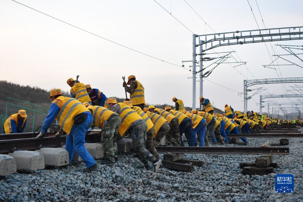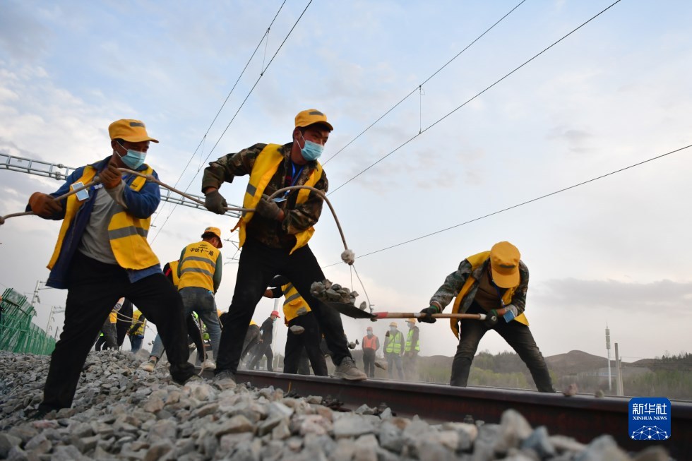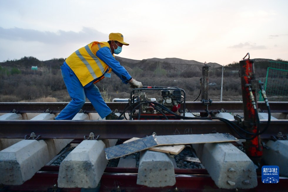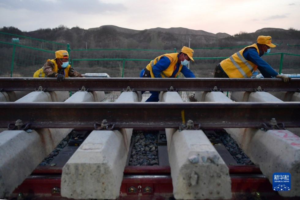 中鐵十一局建設者在中蘭客專(甘肅段)接入中川城際鐵路道岔插鋪施工現(xiàn)場作業(yè)(4月26日攝)。新華社記者 陳斌 攝