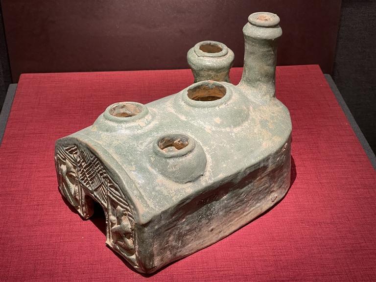 綠釉陶灶高21厘米,長(zhǎng)28厘米,寬19.5厘米,為蘭州市博物館館藏二級(jí)文物。陶灶反映了當(dāng)時(shí)人們的生產(chǎn)生活和思想觀念。漢代之所以流行陶灶模型,主要原因有二,一是兩漢時(shí)期大土地所有制經(jīng)濟(jì)的盛行使得豪門貴族占據(jù)社會(huì)主要地位,而“事死如事生”的觀念促使他們隨葬大量明器,以求在陰間繼續(xù)享受榮華富貴。二是由于漢代的祭灶思想助推了陶灶的流行。