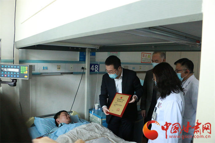 甘肅省紅十字會(huì)黨組書記、專職副會(huì)長(zhǎng)楊芳勝為甘肅省第54例造血干細(xì)胞捐獻(xiàn)者龔先生頒發(fā)“博愛金獎(jiǎng)”和榮譽(yù)證書