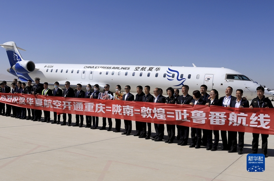 3月26日,由華夏航空執(zhí)飛的重慶-隴南-敦煌-吐魯番往返航線正式通航,這是首航航班機(jī)組人員與機(jī)場工作人員在甘肅敦煌莫高國際機(jī)場合影。新華社發(fā)(張曉亮攝)