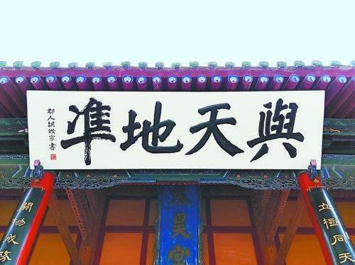 “與天地準”出自《周易·系辭傳上》。原句為:“易與天地準,故能彌綸天地之道”。準,意為等、等同(此依高亨解)。有學者或?qū)?ldquo;準”解釋為標準,或解釋為法則等,唯高解最貼原意;彌,意為遍,普遍;綸,意為絡(luò),包絡(luò)。彌綸,意即普遍包絡(luò)。此句可釋為:《易》所闡述的“性命之理”是與天地運行的自然法則等同的,所以它能夠包容天地之間萬事萬物的運行規(guī)律。匾文“與天地準”,是贊頌伏羲首創(chuàng)的八卦,高度概括了天地萬物運行之規(guī)律,為人們認識世界、改造世界提供了思想武器。