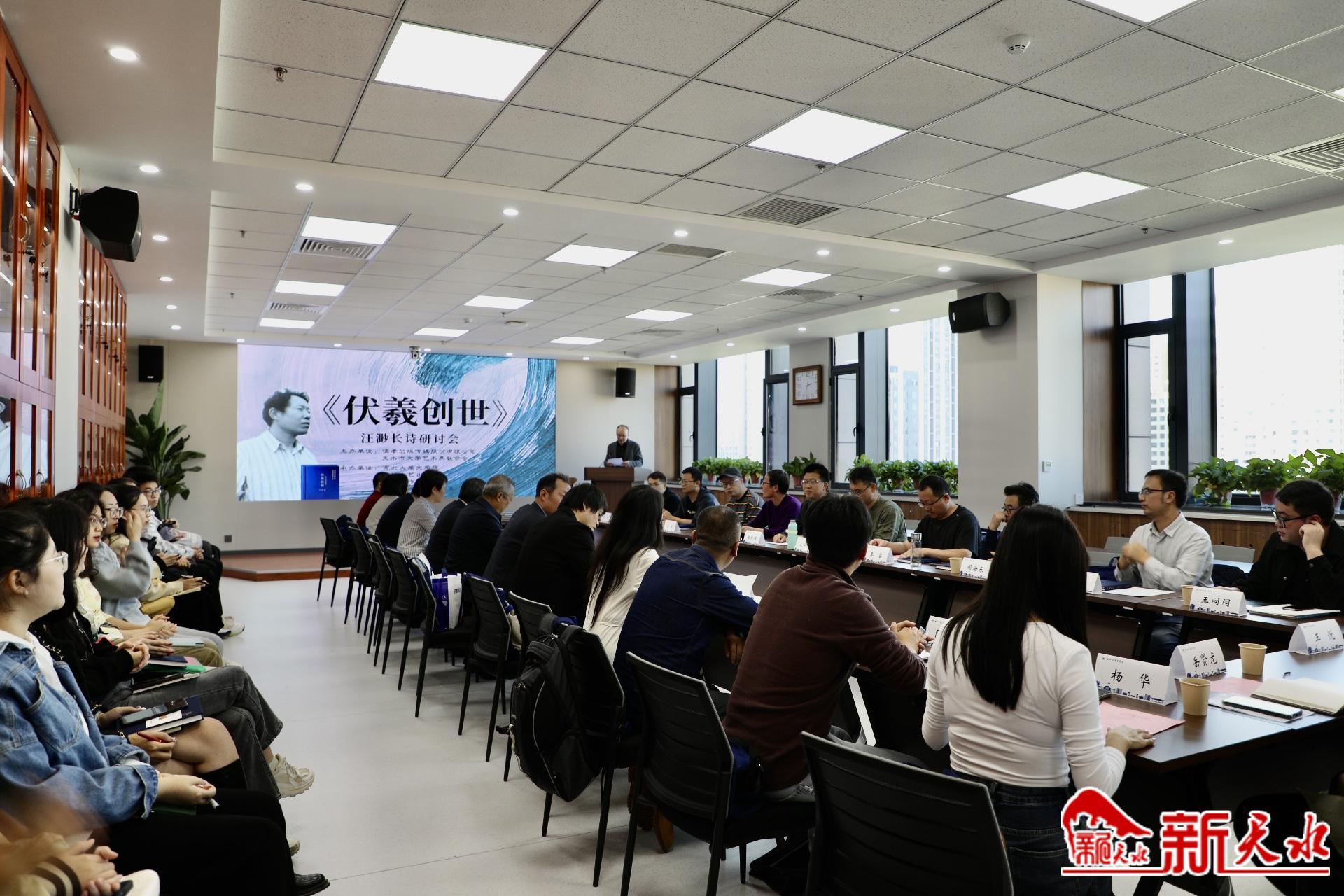 西北大學(xué)文學(xué)院副院長(zhǎng)陳然興主持研討會(huì)。西北大學(xué)文學(xué)院副院長(zhǎng)陳曉輝致辭。天水市文聯(lián)黨組書記、主席楊清汀,敦煌文藝出版社社長(zhǎng)楊繼軍,詩人、評(píng)論家宋寧剛,導(dǎo)演、作家、詩人陳非等來自甘肅及陜西兩地的作家、評(píng)論家、導(dǎo)演、編輯共約30人,就汪渺作品《伏羲創(chuàng)世》展開深入交流,在史詩的界定、文本閱讀感受以及作品的再創(chuàng)造等層面進(jìn)行探討。