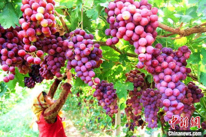 敦煌市莫高鎮(zhèn)農民在采摘葡萄。(資料圖)張曉亮 攝