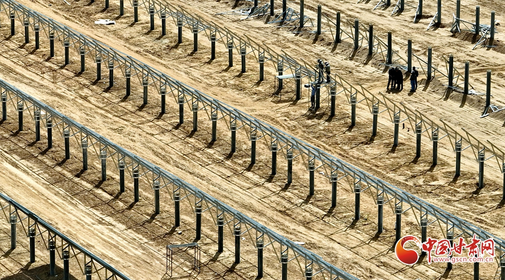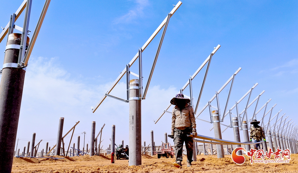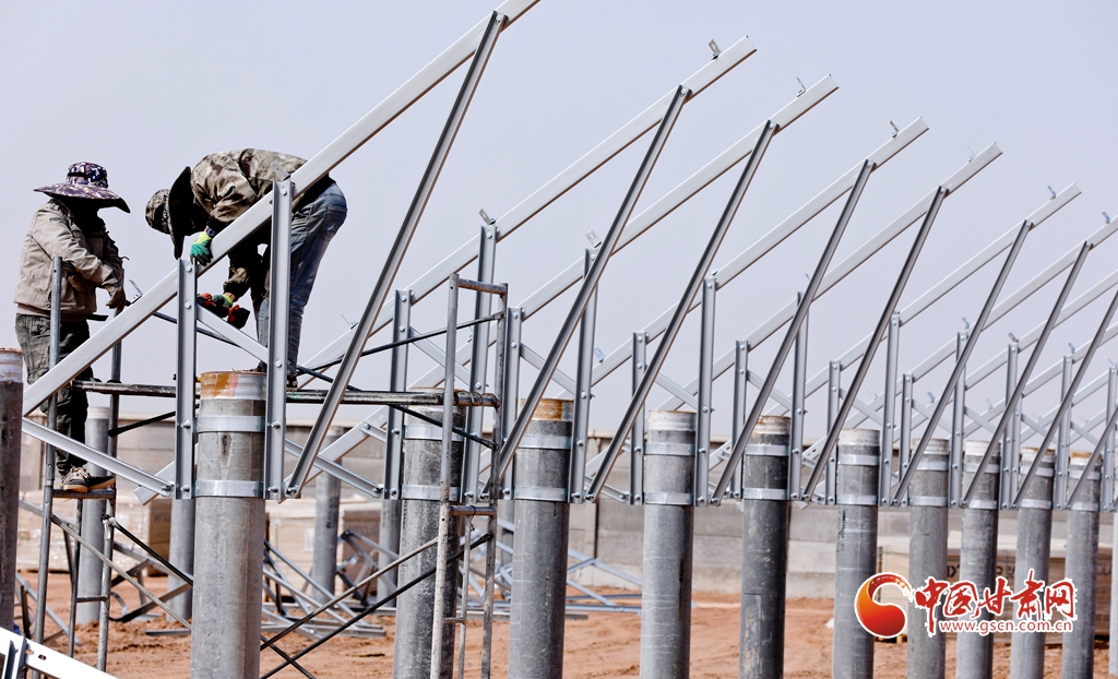 4月15日,甘肅省張掖市臨澤縣板橋鎮(zhèn)一養(yǎng)殖場(chǎng)工地上,工程建設(shè)者們正在安裝光伏板。