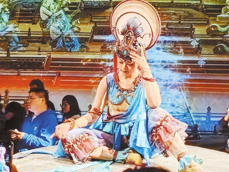 “真是一場酣暢淋漓的敦煌樂舞盛宴。雖然這趟旅程我們還沒有去敦煌莫高窟,但看罷這場演出,已經(jīng)對莫高窟壁畫有了初步的認(rèn)知。莫高窟壁畫的精華部分,借助高科技手段和演員的精彩演繹,在我們眼前立體延展開來,同時劇場內(nèi)大量復(fù)刻了佛龕、蓮花臺、藻井等特色形制,讓我們‘一眼入境’,帶我們走進歷史深處,觸摸文明脈動。”浙江游客王松攜家人觀看《樂動敦煌》后,發(fā)出贊嘆。