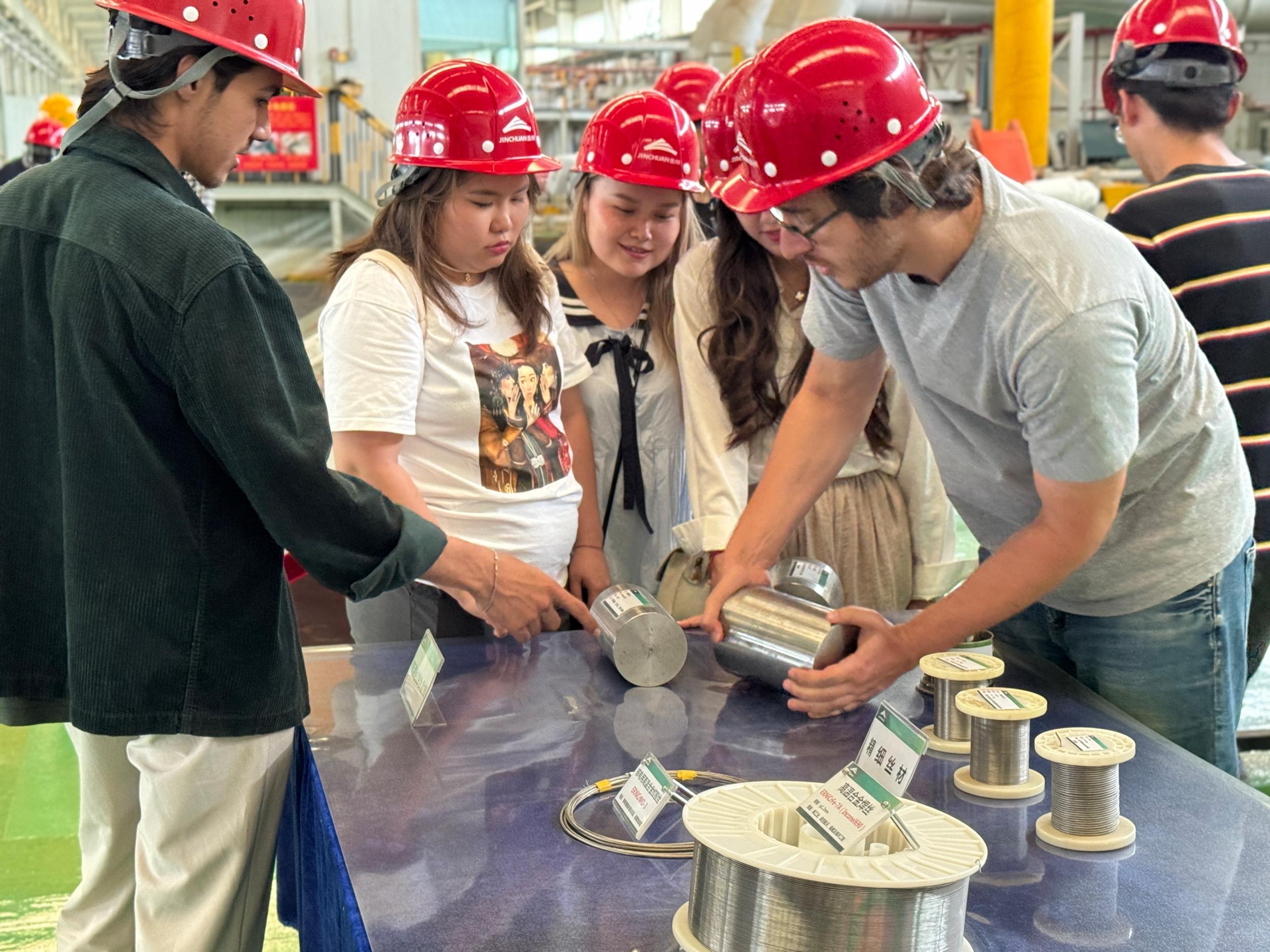 “國際體驗官”們在鎳合金產品展示區(qū)交流互動