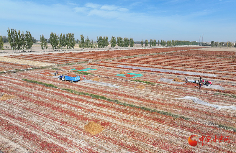 “我們種植的辣椒品種主要是朝天椒,成熟后需要先割倒擺放在壟溝上晾曬,一方面是辣椒干透后機械脫粒,另一方面也是為了防霜凍。這些朝天椒都是訂單辣椒,等過幾天曬好后由企業(yè)統(tǒng)一收購,直接運走,每畝產(chǎn)量500公斤左右,每畝收益能達(dá)到5000元以上。”種植大戶韓克紅說。