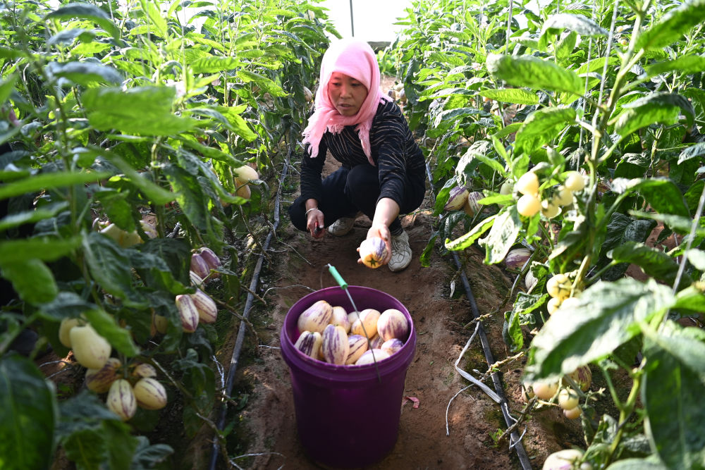 在古浪縣干城鄉(xiāng)富民新村日光溫室大棚內(nèi),村民采摘人參果。新華社記者范培珅攝