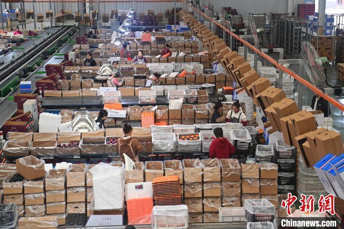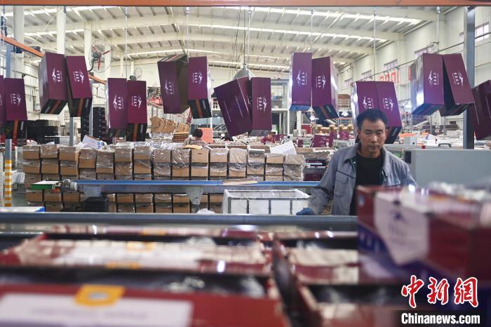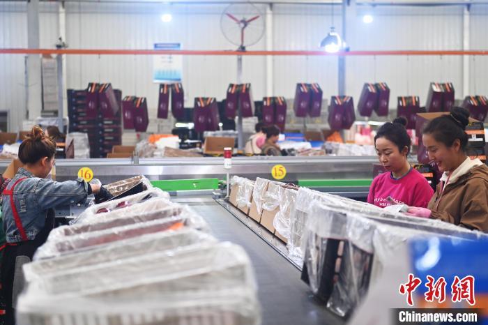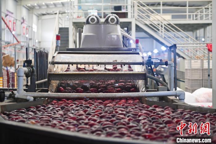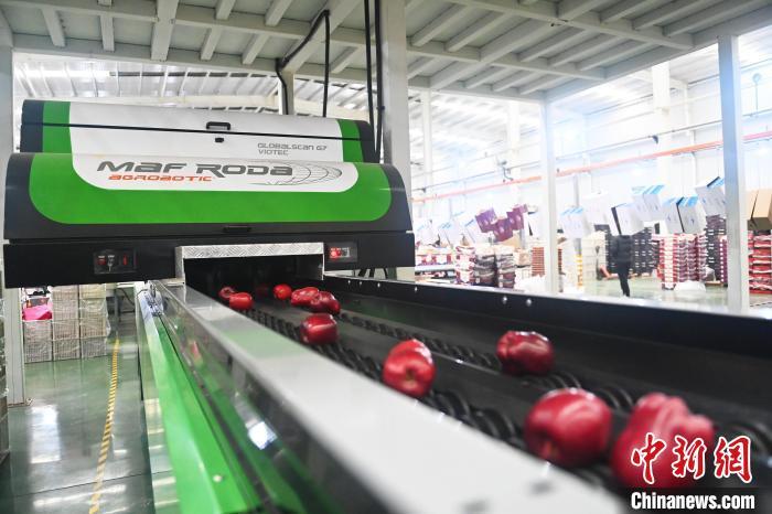 10月21日,在甘肅省天水市秦安縣雪原果品有限公司加工車(chē)間,蘋(píng)果自動(dòng)化分揀線(xiàn)上工作人員進(jìn)行分揀工作。該生產(chǎn)線(xiàn)每天能處理30噸蘋(píng)果,蘋(píng)果經(jīng)過(guò)設(shè)備水洗、烘干、稱(chēng)重等環(huán)節(jié),進(jìn)入不同等次的包裝線(xiàn),工人們?cè)賹?duì)每顆蘋(píng)果進(jìn)行復(fù)檢、貼標(biāo),分裝在不同規(guī)格的包裝箱中。甘肅秦安蘋(píng)果總面積61.37萬(wàn)畝,產(chǎn)量86.8萬(wàn)噸,產(chǎn)值55.6億元人民幣,先后從國(guó)內(nèi)科研院所引進(jìn)青砧、M26、ZH5等抗重茬蘋(píng)果矮化砧木6個(gè),配合國(guó)家蘋(píng)果產(chǎn)業(yè)技術(shù)體系,引進(jìn)長(zhǎng)富2號(hào)、煙富6號(hào)、煙富8號(hào)、瑞香紅等蘋(píng)果新品種12個(gè)。中新社記者李亞龍攝