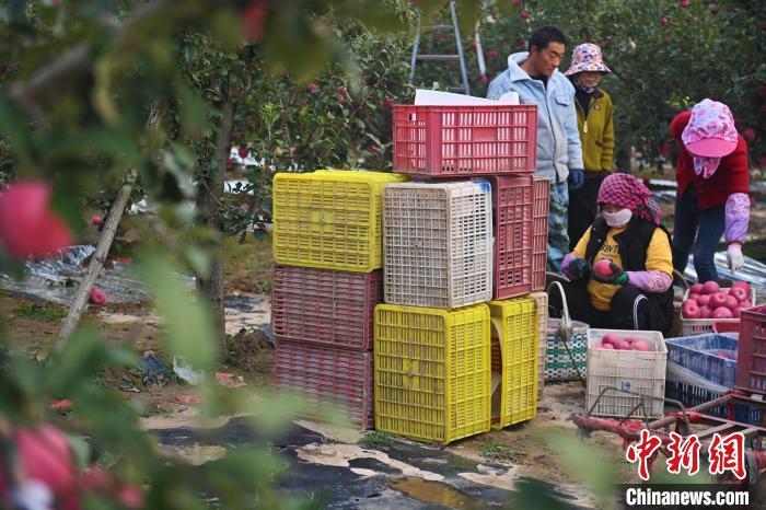 10月21日,在甘肅省天水市秦安縣一果園內(nèi),果農(nóng)進(jìn)行蘋(píng)果采收工作。中新社記者李亞龍攝