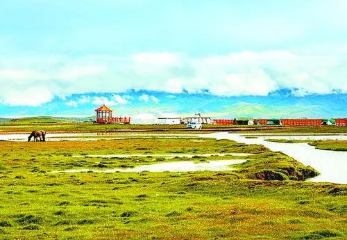 河曲馬場(chǎng)景區(qū)以熱爾欽濕地草原、熱爾欽湖為主要自然景觀(guān),目前建有神駒廣場(chǎng)、高原馬術(shù)活動(dòng)基地、步行街、親水濕地觀(guān)光平臺(tái)、星空帳篷酒店、房車(chē)帳篷營(yíng)地、熱氣球觀(guān)光基地、瑪緹高端酒店等配套附屬設(shè)施。大自然在這里集高原湖濱濕地、沼澤濕地、高寒草原于一體,構(gòu)成了復(fù)合型的別樣景觀(guān)。
