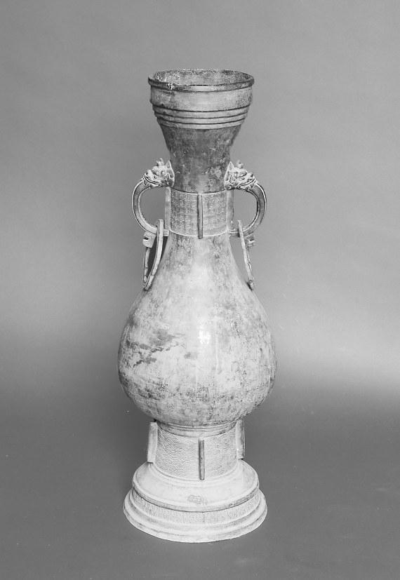 明獸面銜環(huán)耳銅瓶:該銅瓶古樸修長、厚重。銅瓶為一對,形制及紋飾相同,高0.9米,口徑0.19米,重43.86千克。直口,外卷方唇,束長頸,對稱置獨角獸吐舌形半環(huán)耳,下帶小珥,耳套如意形環(huán),垂膽形腹,束高脛,下為折肩形圈足,足口外撇,無底??谘叵嘛椚腊枷壹y,頸部飾四個等分菲棱,間以雷地紋,脛部飾四菲棱間以鱗形波浪紋,圈足飾菲棱形回紋。銅瓶原存放于崆峒山太和宮真武殿真武像前,置于韓王鼎左右。