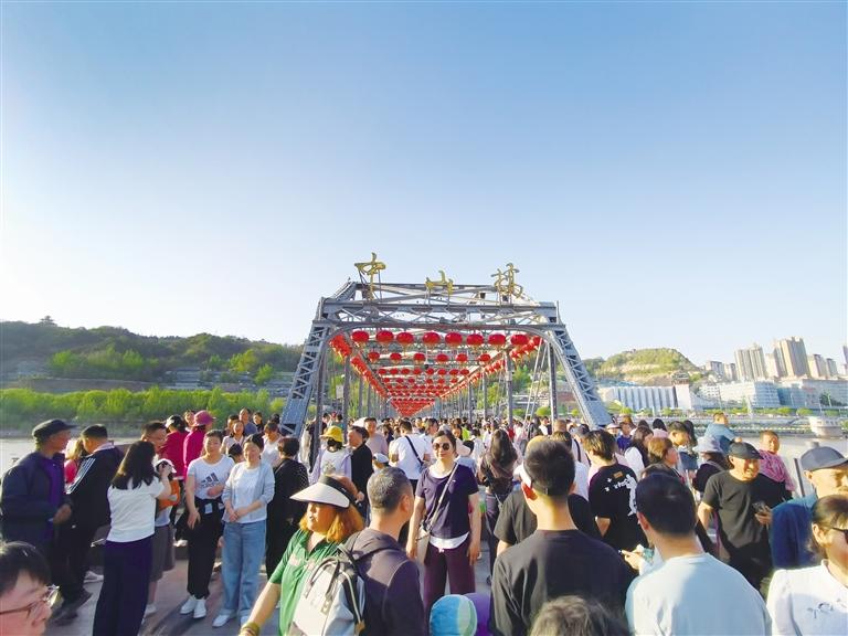 蘭州以火樣熱情和西北風(fēng)情吸引天南海北游客紛至沓來(lái),人們?cè)跓熁饸夂臀幕吨g尋找到這座城市的獨(dú)特魅力。圖為中山橋前游人如織。