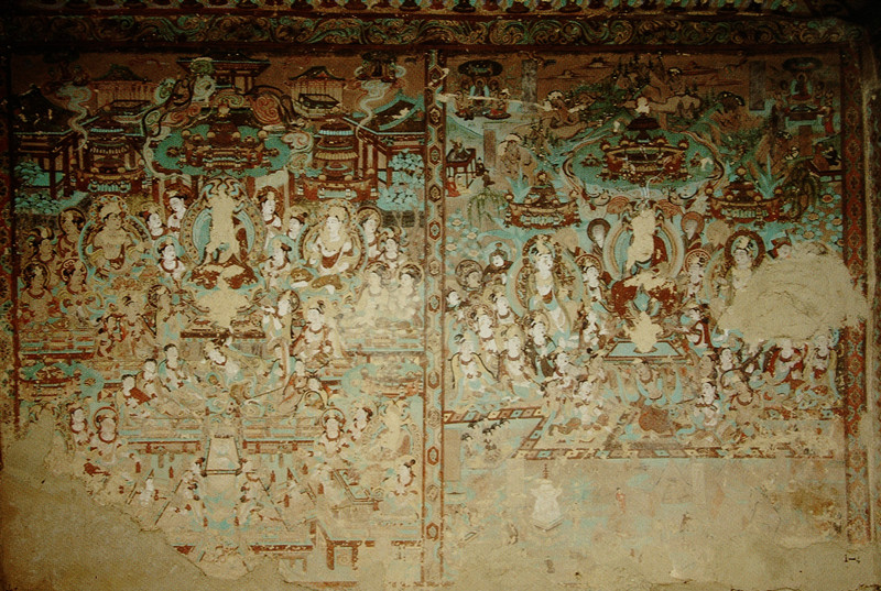 畫(huà)面中的人物造型嚴(yán)格遵循唐代仕女的畫(huà)風(fēng)繪制,顯得豐腴飽滿(mǎn),恰似盛唐時(shí)期雍容華貴的氣質(zhì)寫(xiě)照。線描寫(xiě)實(shí)明快,流暢飛動(dòng),一氣呵成,仿佛是畫(huà)師用靈動(dòng)的筆觸在墻壁上勾勒出的生命樂(lè)章。畫(huà)面的顏色以石綠、赭黃、鉛白為主色。整個(gè)畫(huà)面顯得典雅、嫵媚,令人賞心悅目。雖然伎樂(lè)天頭部原本貼金的頭飾已經(jīng)剝落,但歲月的痕跡并未減損她雍容華貴的氣質(zhì),反而更增添了一份歷史的厚重感。