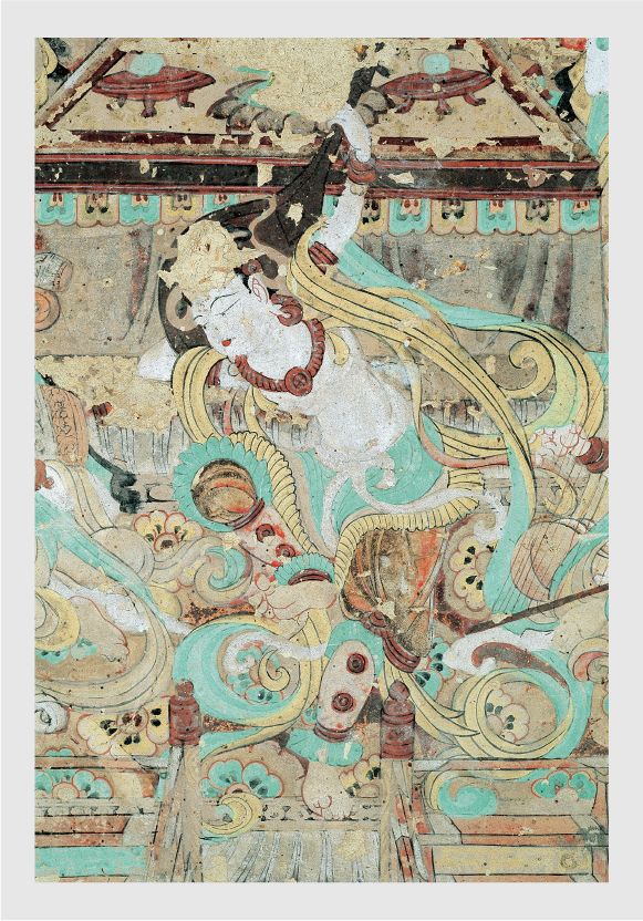 為了生動(dòng)地表現(xiàn)出舞樂(lè)的真實(shí)感,畫(huà)師巧妙地采用了透視的技法。通過(guò)這種透視技法,觀者仿佛置身于真實(shí)的演出現(xiàn)場(chǎng),能夠真切地感受到伎樂(lè)天伴著仙樂(lè)翩翩起舞的美妙場(chǎng)景。她修長(zhǎng)的飄帶也隨著舞姿而扭動(dòng)起來(lái),仿佛有了生命一般。一千年之后,畫(huà)面被定格在了那一刻,成為了永恒的經(jīng)典。