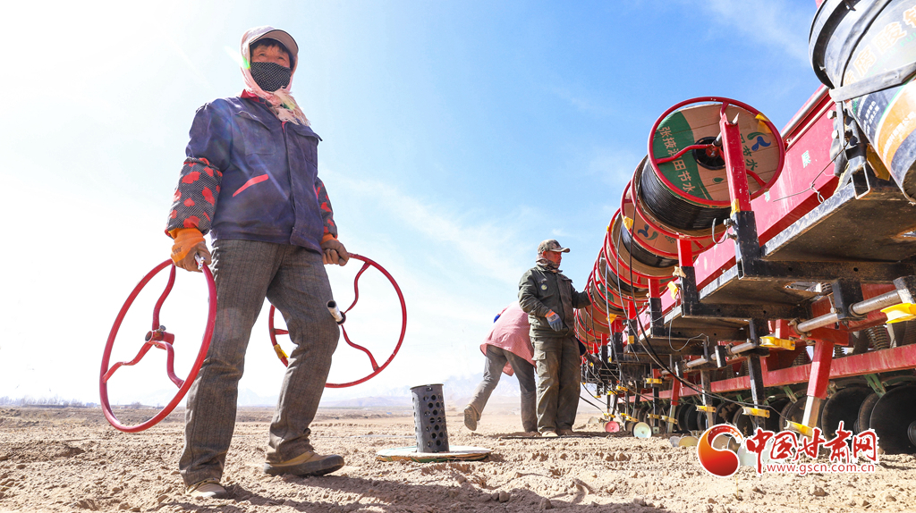 4月1日,位于祁連山下的張掖市甘州區(qū)花寨鄉(xiāng)金花寨種植專業(yè)合作社小麥種植基地里,農(nóng)戶們正在安裝滴灌帶。