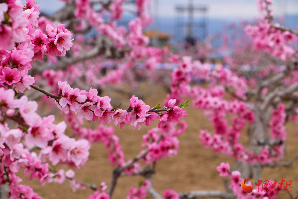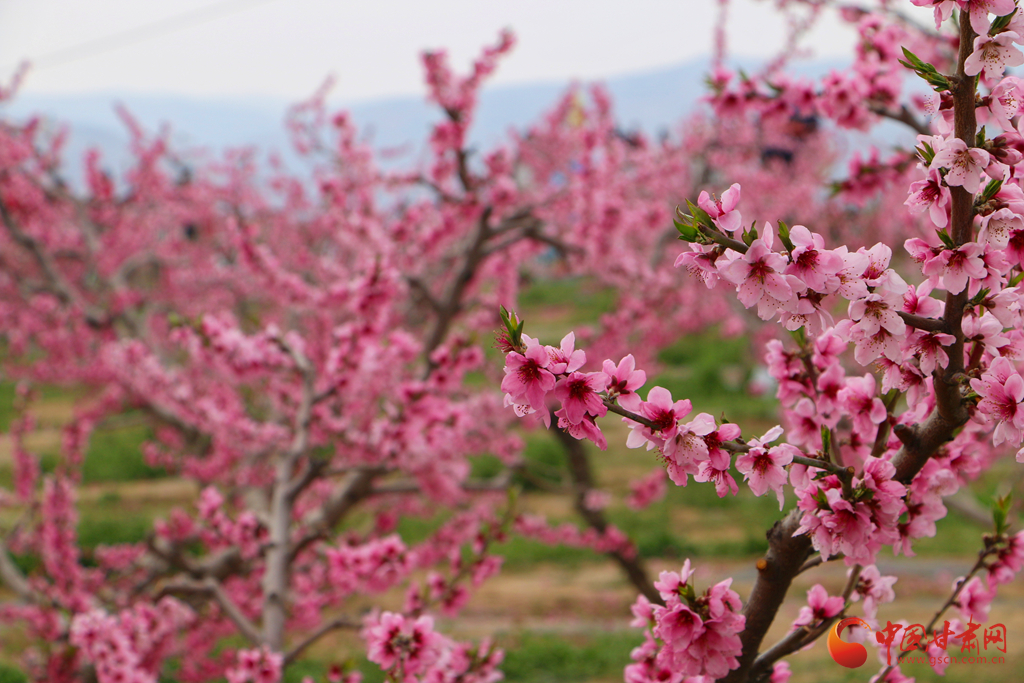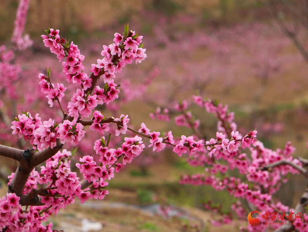 春風(fēng)拂過,桃花競相綻放,粉花滿枝與遠山交相輝映,宛如一幅詩意畫卷。