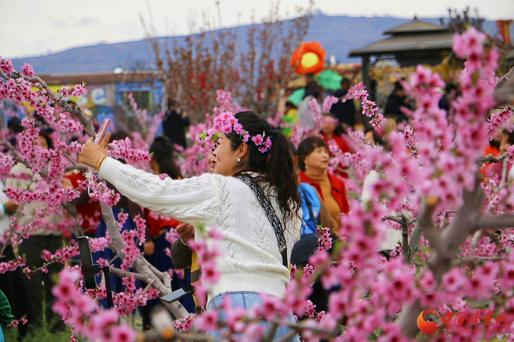 游客頭戴花環(huán),在花海中打卡留念,成為桃林里一道靚麗的風(fēng)景線。