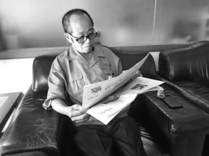 吳桂春在讀報(bào)。
