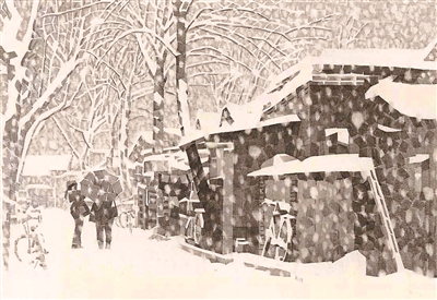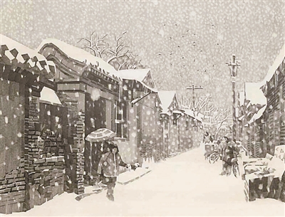 休息日,大雪天,況晗背著畫具出門作畫。濕式水彩畫,講究水色淋漓,是用排筆將清水洇濕畫紙然后作畫。一幅寫生未成,畫筆已然結(jié)冰。況晗的家鄉(xiāng)氣候濕潤,墻縫里面生的是青苔。北京的氣候干燥,墻縫里面積存的是數(shù)百年的塵土。家鄉(xiāng)村野的色調(diào)是青綠,京城胡同的色調(diào)是灰白,于是況晗改用寬線條鉛筆畫來寫意胡同。