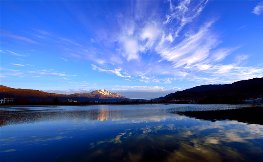 我是被亮光驚醒的。我和很多水從象山腳下的黑龍?zhí)睹俺鰜怼9具艘宦暦纤?。看見很多不同模樣的人。黑頭發(fā)的人,黃頭發(fā)的人。黑眼睛的人,藍(lán)眼睛的人。我看見了潭邊的亭臺樓閣??匆娏嘶ㄅc樹。我還順著人們遠(yuǎn)眺的目光看見了玉龍雪山,晶瑩奪目矗立在藍(lán)天下面。潭水映照雪山,真讓人目眩神迷啊。人們在橋上,在堤上,說著不同的語言。在不同的語言里,都有那個詞頻頻出現(xiàn):麗江,麗江。這時的麗江已經(jīng)是一座很大的城了。城里也不是只有最初筑城的納西人了。如今全中國全世界的人都要來麗江,看納西古城的四方街,看玉龍雪山。