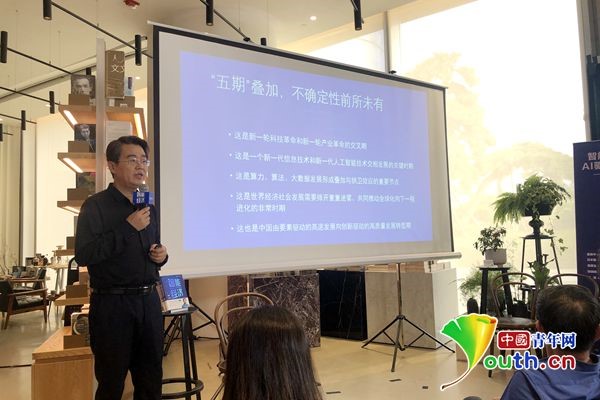《智能經(jīng)濟》新書研討會上,張曉峰在進行主題演講。中國青年網(wǎng)記者 張詩瑩 攝