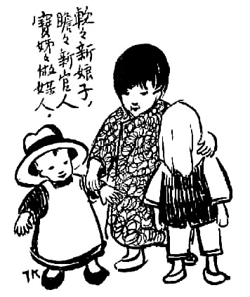 子愷先生藝術(shù)之獨(dú)特在另一方面——獨(dú)樹(shù)高標(biāo),表現(xiàn)童心童趣,抒情融入詼諧,展示了一種美學(xué)境界。此類(lèi)經(jīng)典之作大多收集于《兒童相》。令人過(guò)目不忘者如畫(huà)孩子持兩蒲扇,一前一后,作騎馬狀,題曰“瞻瞻的腳踏車(chē)”;孩子將自己的鞋子墊于四腳圓凳之下,題曰“阿寶兩只腳,凳子四只腳”。于兒童經(jīng)驗(yàn)之局限寫(xiě)其心靈之天真,于不起眼的、平常人視之無(wú)所謂的現(xiàn)象中發(fā)現(xiàn)童心之美。還有一幅令人印象深刻,三個(gè)孩子,一女稍高,立于中,左側(cè)男孩,戴英式禮帽,甚大,右側(cè)女孩,頭蒙面布,題曰“軟軟新娘子,瞻瞻新官人,寶姊姊做媒人”。其事極不現(xiàn)實(shí)而孩子極慎重,于兒童顯示童心童趣,于畫(huà)則表現(xiàn)了先生的愛(ài)心和幽默。