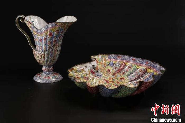 館藏的銅胎畫(huà)琺瑯花卉紋洗盤(pán)及水澆。廣東省博物館 供圖