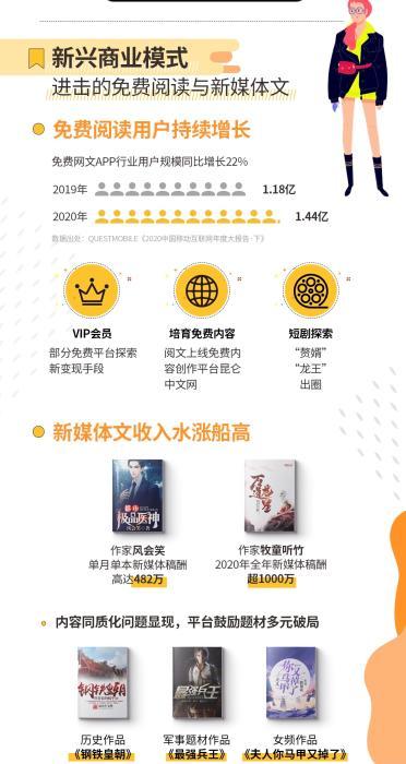 而在近年,免費(fèi)閱讀和新媒體文成為新興商業(yè)模式,得到快速發(fā)展。其中,免費(fèi)閱讀和新媒體文激活了下沉市場(chǎng),成為刺激數(shù)字閱讀市場(chǎng)快速發(fā)展的新興力量,為網(wǎng)絡(luò)文學(xué)的內(nèi)容和用戶帶來(lái)新增量,也拓寬了網(wǎng)絡(luò)文學(xué)市場(chǎng)規(guī)模。