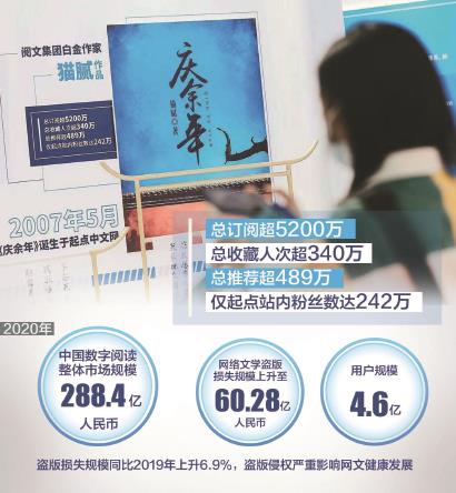 有數(shù)據(jù)顯示,2020年中國(guó)網(wǎng)絡(luò)文學(xué)市場(chǎng)規(guī)模為288.4億元,網(wǎng)絡(luò)文學(xué)通過IP全版權(quán)運(yùn)營(yíng)間接或直接影響了動(dòng)漫、音樂、影視、游戲等合計(jì)約2531億元的市場(chǎng),對(duì)數(shù)字文化產(chǎn)業(yè)的影響范圍超過40%。但令人痛心的是,2020年中國(guó)網(wǎng)絡(luò)文學(xué)盜版損失規(guī)模達(dá)60.28億元,同比上升6.9%。