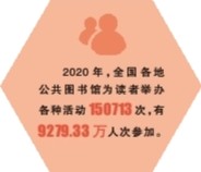 數據顯示,全國各級公共圖書館普遍開展講座、展覽、閱讀指導、讀書交流、演講誦讀等活動。僅2020年,各地公共圖書館就為讀者舉辦各種活動150713次,有9279.33萬人次參加。