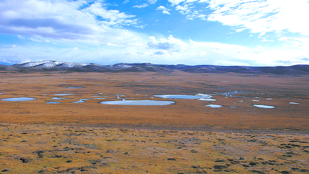 約古宗列位于青藏高原東北部,海拔高度在4200米~4800米,地勢(shì)西北高,東南低。站在腳下小泉邊,抬眼先看到的是西面距我們最近的雅合拉達(dá)合澤山,它是1952 年新中國(guó)第一個(gè)河源查勘隊(duì)曾認(rèn)定的黃河源頭山。南望,遠(yuǎn)處最高的雪峰,是長(zhǎng)江黃河的分水嶺巴顏喀拉山;視線(xiàn)左移,東方藍(lán)天白云下,同樣白雪皚皚的是阿尼瑪卿山。以約古列宗為中心輻射,在這東西長(zhǎng)約220 公里,南北最大寬150 公里的高山草甸帶與高山草原帶的過(guò)渡地帶,東面阿尼瑪卿山阻擋了東南暖濕氣團(tuán)西進(jìn),南面巴顏喀拉山又削弱了溯谷地北進(jìn)的西南季風(fēng)勢(shì)頭,再加之北面布爾漢布山的屏障作用,把源區(qū)與干旱的荒漠地區(qū)隔開(kāi),使這里年平均氣溫在-4℃左右。青藏高原半濕潤(rùn)地區(qū)氣候和遠(yuǎn)處雪山冰川的不斷融化,使母親河上源的兩眼泉和其他那些數(shù)不清的泉,源流不斷,經(jīng)年汩汩。