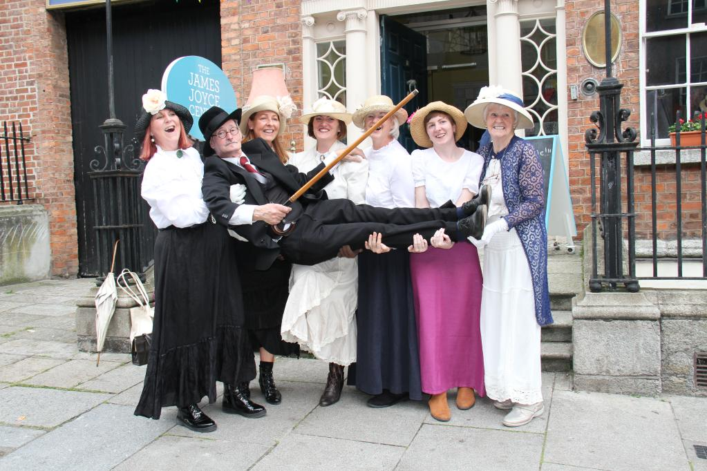 6月16日,在愛爾蘭首都都柏林,人們在詹姆斯·喬伊斯中心前合影。