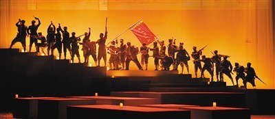 話(huà)劇《鐵流東進(jìn)》是劇場(chǎng)、舞臺(tái)功能有效開(kāi)發(fā)利用的典范。其舞美布景設(shè)計(jì)抽象但巧妙,高高低低的白色積木,可以是陣地、是房子、是山巒,整體來(lái)說(shuō)又象征著摩斯密碼和電波。演員在舞臺(tái)上,跳上跳下,跳入跳出,將表演和舞臺(tái)環(huán)境融為一體。戲中最后一幕,當(dāng)新四軍戰(zhàn)士們的群雕形象出現(xiàn)在舞臺(tái)后方,群體的奔跑涌動(dòng)和舞臺(tái)旋轉(zhuǎn)接口的表現(xiàn),配合著燈光、音樂(lè),給觀眾帶來(lái)強(qiáng)烈的沖擊感和崇高感。
