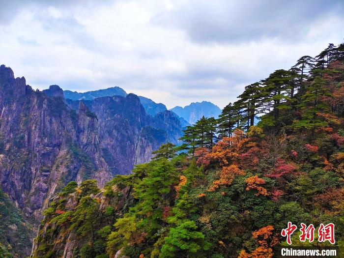 資料圖:黃山風景區(qū)樹木色彩分層,紅黃相間。陳偉 攝