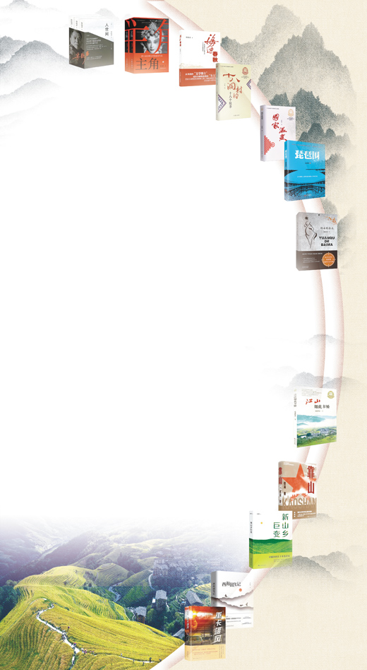 書影圖片從上至下依次為《人世間》《主角》《海邊春秋》《十八洞村的十八個故事》《國家溫度》《琵琶圍》《遠去的白馬》《江山如此多嬌》《靠山》《新山鄉(xiāng)巨變》《西海固筆記》《重卡雄風》(按出版時間排序)。何向陽 供圖;底圖為廣西龍勝各族自治縣龍脊梯田景色。韋吉陽 攝(人民視覺)
