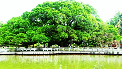 擁有古樹的城市就是擁有歷史的城市。福州古榕遍布,四季常青,是城市、市民生活與樹木的完美結(jié)合,是風(fēng)景的自然生長(zhǎng),是歷史根深葉茂地屹立。福州古榕以樹齡長(zhǎng)、歷史久、數(shù)量眾而著稱。見證福州城市史的,當(dāng)首推鼓山國(guó)家森林公園、八一水庫(kù)旁,福州無人不知的已近千歲,被譽(yù)為福州榕樹王的古榕。相傳,這棵古榕是張伯玉所栽植的兩棵樹苖,光陰荏苒,同氣相求,如今兩棵榕樹相互糾結(jié)、勾連、纏繞、親密,已無分彼此。其冠幅達(dá)1300米,可容納千人在樹下談古論今,聊天遮陰。遠(yuǎn)望,似綠色陵巖;近看,知其為榕也,密密的枝葉把近午的陽光切割成碎花點(diǎn),散落、閃亮在榕樹下的草坪和地衣上。初訪者或?yàn)橛牣悾嘿即笠豢霉砰艆s不見氣根,知榕者會(huì)告訴你,這是一株碩大、古老而不生氣根的細(xì)葉榕。因其冠幅日益長(zhǎng)大,為了支撐沉重的樹冠、預(yù)防主干折損,便制作了若干石柱,砥柱其間。古榕下有湖塘,錦鯉游泳,不時(shí)生出紅色漣漪。旁有一碑,上刻:榕蔭照水波心漾,觀魚猶勝花間行。