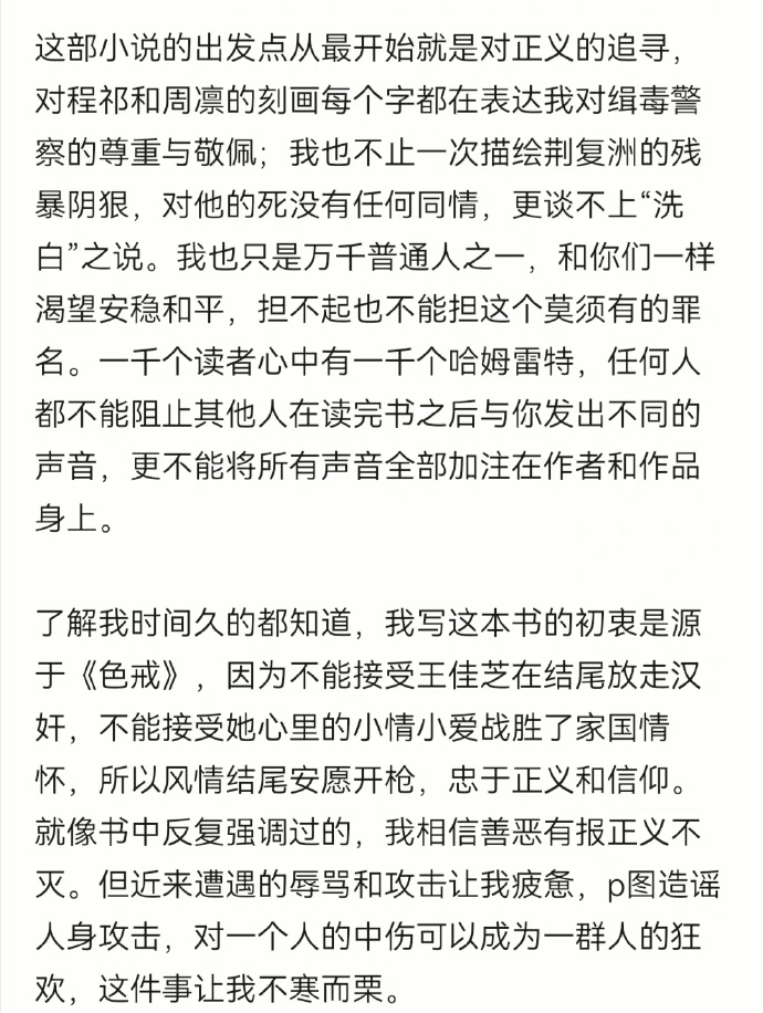 在去年10月14日,疑似《風(fēng)情不搖晃》的作者在其未經(jīng)認(rèn)證的社交媒體賬號(hào)上表示,“小說(shuō)的出發(fā)點(diǎn)是對(duì)正義的追尋”。在發(fā)布這條內(nèi)容后,其賬號(hào)再未更新,該條微博也關(guān)閉了評(píng)論。