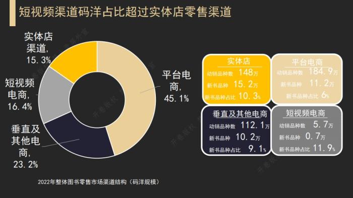另外,2022年零售圖書市場(chǎng)中,短視頻電商碼洋占比趕超實(shí)體店渠道零售占比。目前短視頻電商作為新興電商,聚集越來(lái)越多的用戶注意力。