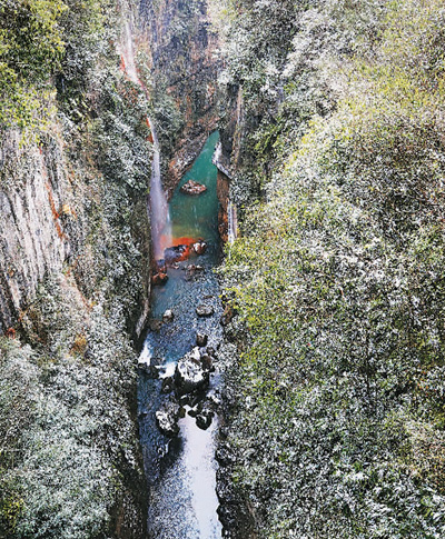 雪花飄飄,沿棧道往下走,山林被染成一幅黑白山水畫。風(fēng)雨橋在地縫之上凌空飛舞,仿佛是通往地心的鑰匙。約75米深的云龍絕壁垂直下切,狹長(zhǎng),呈U型,崖壁皺紋黑灰,宛若剛出鞘的寶劍閃著寒光。底下是云龍河,水淺,清澈,叮叮咚咚,增添些許歡快,而讓地縫變得富有激情的是沐撫盆地流出的7條瀑布,其中最美的是五彩黃龍瀑布。瀑布從60米高的峭壁跌落下來,纖細(xì),飄灑,婀娜。“銀花下散布水臺(tái),混沌鑿破山根隈。”從暗河流出的水含黃鐵礦,把巖壁和卵石刷洗得斑斕,連河水也變得絢麗。