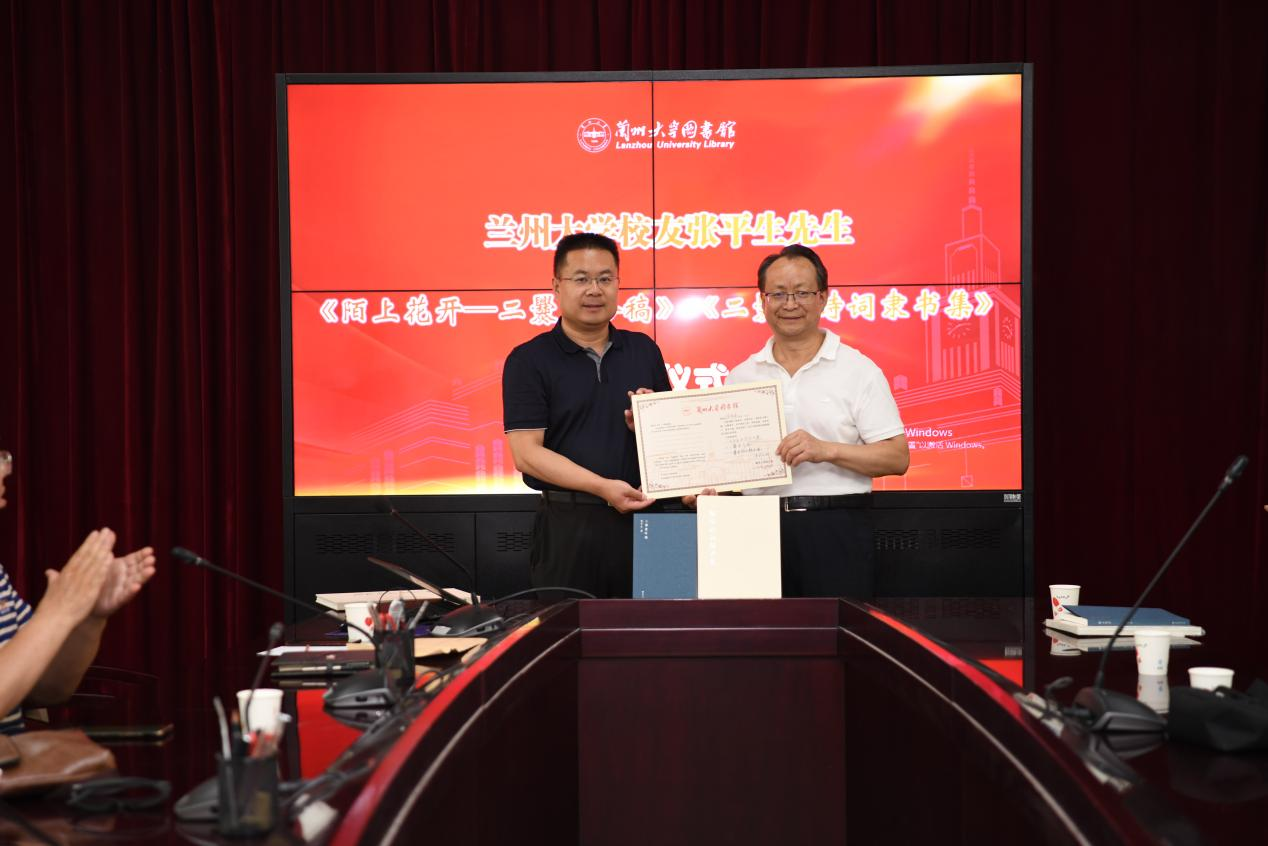 蘭州大學(xué)圖書館及直屬單位黨委書記王偉國向張平生頒發(fā)收藏證書