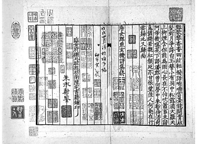 范景中先生曾見過謝蘭墀擺印本《唐宋文醇》,是書“正文用墨印,墨點用朱印,御評用黃印,朱子評用朱印,各家評用藍印,實為四色套印”。至于《唐宋詩醇》,范先生認為是木活字五色套印。其主要依據是《詩醇》凡例云:“評語悉準《唐宋文醇》之例,色別書之,但其中有援據正史雜說用資考訂疏解者,與古今人評詩之語義各有在,《文醇》未經區(qū)別,今于藍筆之外,另作綠筆書,以便閱者,燦若列眉。”按照凡例的說法,《詩醇》在《文醇》朱、墨、黃、藍的基礎上又加了綠色,由此可知是五色套印本。實際上《唐宋詩醇》中并無康熙御評,因此未用黃色。湖南省圖書館藏有一部謝蘭墀擺印本《唐宋詩醇》,八冊,四十七卷全。我們委托張諾丕同學代檢全書,亦僅朱、墨、藍、綠四色而已,由此可知楊成凱先生所說四色套印本是正確的,而《增訂四庫簡明目錄標注》著錄的五色套印本恐不可信。